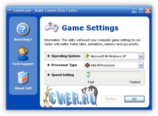 GameGain - программа для увеличения скорости работы игр путем оптимизации компьютера. GameGain вносит изменения в реестр и системные файлы для освобождения оперативной памяти, ускорения прорисовки изображений и использования всех ресурсов процессора. Программа проста в использовании, обладает простым и понятным интерфейсом, совместима со всеми версиями Windows, позволяет непосредственно вносить изменения в реестр, может автоматически выставлять правильные настройки и т.д.
