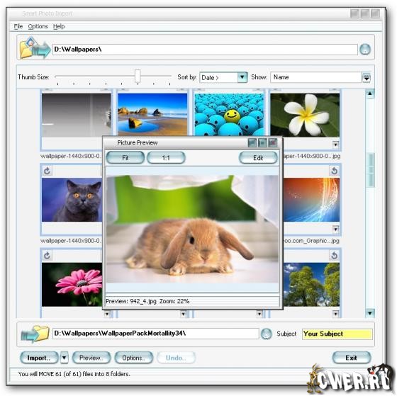 Smart Photo Import - программа, которая помогает Вам обращаться с Вашими цифровыми фото и очень легко архивировать их на вашем компьютере. Главная цель программного обеспечения состоит в том, чтобы импортировать фотографии от вашей цифровой камеры или любого другого устройства (флэшки и т.д.) и автоматически организовывать их в папках на Вашем PC. Smart Import - совершенный инструмент для любого фотографа. Программа может читать непосредственно даты фотографий и соответственно переименовывать их.