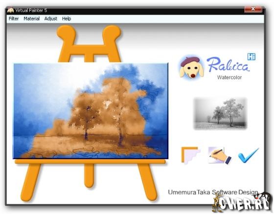 Всего несколько нажатий кнопок в интерфейсе пакета Virtual Painter позволят превратить любительскую фотографию в настоящее произведение искусства. Великолепный набор из 16 фильтров. Можно выбрать различные типы кистей или изменить вид рисунка с использованием 10 разных материалов подложки. Может работать как отдельная программа, и как плагин в Jasc Paint Shop Pro, Adobe Photoshop, Adobe Elements и в любой другой программе, поддерживающей плагины формата Adobe. Позволяет сохранять и загружать настройки.