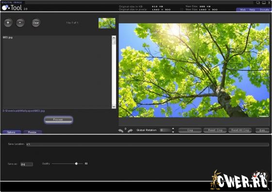 Digital Image Tool - программа для работы с цифровыми фотографиями. Позволяет обрабатывать большое количество файлов в пакетном режиме. С ее помощью можно защищать изображения "водяными знаками", поворачивать картинки под определенным углом, изменять разрешение, масштабировать и обрезать цифровые фотографии. Утилита открывает директорию с фотографиями рекурсивно, добавляя все файлы в её подкаталогах. Открытые файлы можно быстро сохранить в графические форматы BMP, TIFF или JPG, выбрав необходимое качество. Кроме того, присутствует возможность переименования файлов. Поддерживается обработка изображений, ширина и высота которых превышает 8000 пикселей. При желании понравившуюся картинку можно поставить в качестве обоев на Рабочий стол.