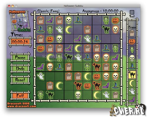 Судоку в оригинальном оформлении в стиле Хэллоуина ждёт вас. Вместо стандартных цифр вы повстречаете изображения забавных тыкв, призраков, черепов, летучих мышей, чёрных кошек, скелетов, привидений и прочей нечисти!