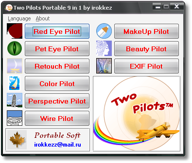 Portable Two Pilots 9 in 1 - портативная сборка, состоящая из девяти программ для работы с цифровыми изображениями от компании Two Pilots. При помощи этой сборки Вы сможете без труда улучшить качество Ваших цифровых фотографий. Каждая из программ, входящих в сборку, имеет демонстрационные примеры, большинство программ имеет справку на русском языке.