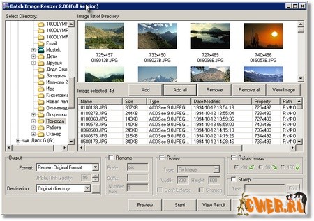 Batch Image Resizer - небольшая утилита для пакетной обработки и конвертации графических файлов. Batch Image Resizer работает со всеми основными графическими форматами (JPEG, BMP, GIF, PCX, PNG, TIF), позволяет изменять размер изображений, осуществлять поворот, наносить заданный текст и переименовывать графические файлы.