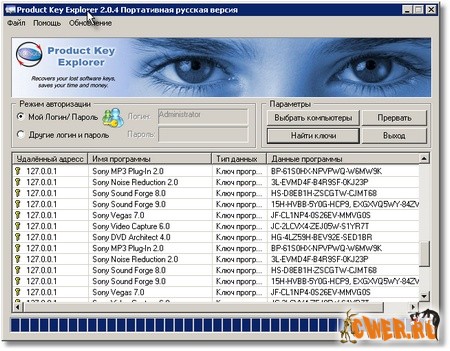Product Key Explorer - позволяет расшифровать и увидеть,а также сохранить серийные номера (Product ID, Product Key, License Info, User Name, Company) продуктов Microsoft, CD-key установленных на компьютере программ, и не только их. Неполный список ПО, регистрационные данные которых можно увидеть и сохранить: Micrsoft Windows (2000, XP, 2003, Vista), Microsoft Office 2003, Microsoft Office 2007, Microsoft Office XP, Micrsoft Visual Studio 2005, Macromedia, Ahead Nero, Adobe Photoshop, CyberLink PowerDVD, Borland Delphi и т.д. (более 40 продуктов). После запуска программы достаточно будет нажать Find Keys и она сама просканирует реестр, и выдаст список программ, установленных на компьютере и регистрационные данные к нем. В программе есть окно для авторизации Администратора, если установлены ограничения на уровне пользователей. Может работать по сети с другими компьютерами и по заданному диапазону IP адресов или по списку IP в текстовом документе.