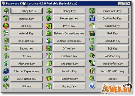 Passware Kit - набор утилит для подбора паролей к файлам, созданным с помощью следующих программ (всего 37): Windows, Excel, Word, WinZip, Access, Outlook, SQL, QuickBooks, Internet Explorer, VPN, PowerPoint, Acrobat, WordPerfect, OneNote, Lotus Notes, Quicken Quattro Pro, BestCrypt, Outlook Express, ACT, 1-2-3, Paradox и других. Поддерживает более 30 расширений, таких как: xls, doc, mdb, mdf, zip, pdf, pst, wpd, qdf, pls, myo, 123, blb, mud, adf, qic, mmf, mny, mpp, id, db, qpw, jbc и другие..., а также подбор Windows XP/2000/NT key.