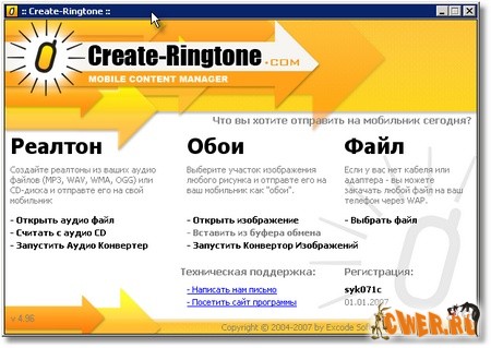 Create Ringtone - программа для создания MP3 рингтонов из любого аудио файла. Для переноса в телефон поддерживается IrDA, Bluetooth и USB соединения. Также Create Ringtone умеет отправлять файлы, через WAP! Допонительно програма может изменять выборку и битрейт или усиливать звук, отправлять обои и другие файлы для твоего телефона. Предварительный просмотр дает возможность точного представления о том, как будут звучать новые мелодии.