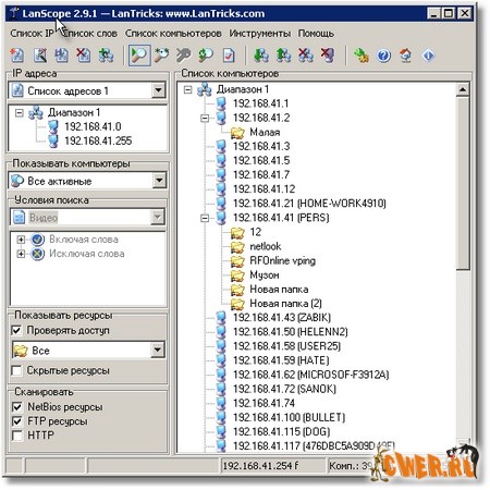 Описание: LanScope — это многопотоковый сканер локальной сети. Осуществляет мониторинг сети на наличие доступных ресурсов NetBios (Samba), FTP и HTTP, сканируя заданные диапазоны IP-адресов. Показывает права доступа к ресурсам: чтение, запись. Сканер ресурсов выполняет поиск по заданному имени ресурса, например, music, video и т.п.