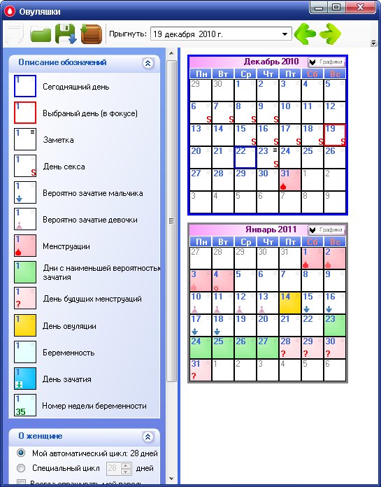 Cамая простая и удобная в мире программа для ведения женского календаря. Главное свойство программы - максимальная интуитивность и максимальная простота в обращении. Она полностью бесплатна, отсуствуют баннеры и прочая рекламная чушь. Самая главная особенность программы - она очень проста в управлении и понимании. Сделана для женщин и ради женщин.