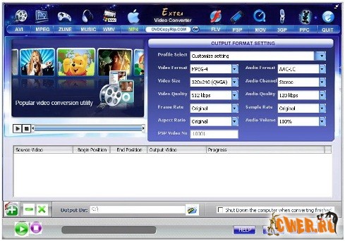 Extra Video Converter - мощный и универсальный видео конвертер популярных видео форматов. Простота в использовании, делает это программное обеспечение просто незаменимым для домашнего пользования.