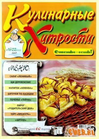 Кулинарный журнал "Кулинарные хитрости" № 22 2007 год В номере - салат "Ленивый", щи деревенские, напиток "Клюква", биточки по-казацки, печенье "Тайна", пирог "Родительский дом", торт "Прелесть", "Шреки", всего более 60 вкусных рецептов.