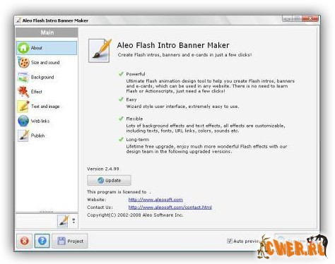 Простой и чрезвычайно удобный пользовательский интерфейс программы Flash Intro and Banner Maker, в стиле мастера, поможет вам создать различные по красоте и креативности баннеры всего несколькими щелчками мыши без какого либо знания основ Flash и его Actionscriptов. Имеет множество фоновых и текстовых эффектов, которые настраиваемы, включая предложения, шрифты, связанные интернет ссылки на ресурсы, раскраска, звуки и т.д.