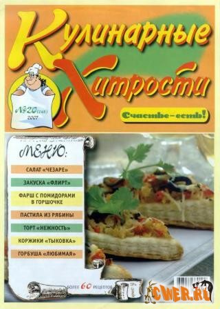 Кулинарный журнал Кулинарные хитрости № 20 2007 г. В номере - салат "Чезаре", закуска "Флирт", фарш с помидорами в горшочке, пастила из рябины, торт "Нежность", коржики "Тыковка", горбуша "Любимая" и множество других вкусных рецептов.