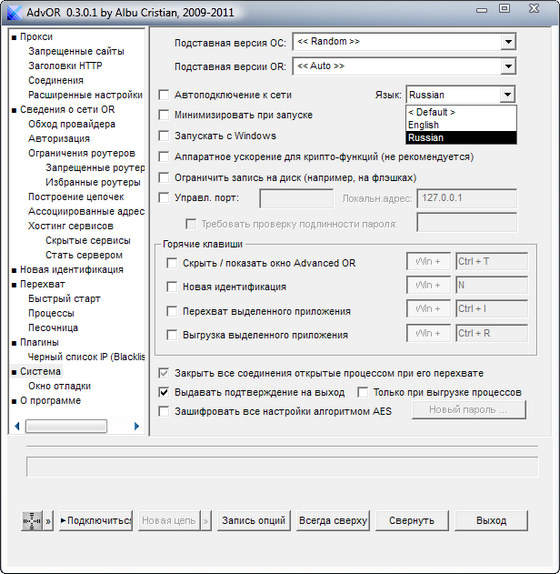 Advanced Onion Router — это клиент для сети Tor, предназначенный для улучшения стандартного комплекта Tor + Vidalia + Polipo для пользователей Windows. Он способен заставлять программы и плагины принудительно использовать прокси-Tor, независимо от его настроек прокси-сервера.