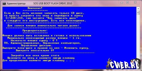 Процесс записи флешки автоматизирован, двойным щелчком запустите файл SOS-USB-BOOT-FLASH-DRIVE-2010.exe, после распаковки файла появится DOS-окно, следуйте его инструкциям.