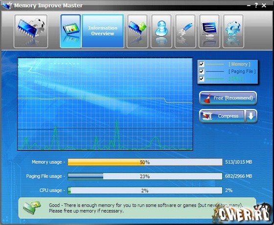 Memory Improve Master – позволяет увеличить быстродействие вашего компьютера за счет освобождения (дефрагментации) оперативной памяти. Имеется возможность установки минимального количество свободной оперативной памяти, при превышении которого запустится модуль и попытается удалить из оперативной памяти лишние процессы. Кроме этого, есть возможность просмотра запущенных процессов, наблюдение за нагрузкой на ЦП и множество других полезных настроек.