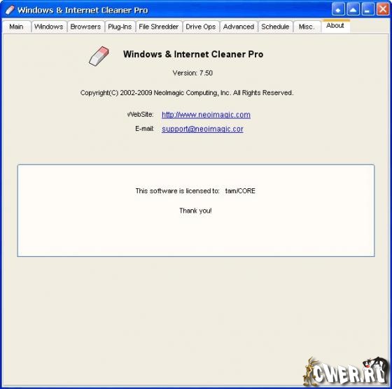 Отличная программа для очистки операционной системы от ненужных файлов. Windows & Internet Cleaner Pro удалеет различные временные файлы, историю переходов и кэш браузера, поддерживает такие браузеры как: IE, Netscape, opera, MSN, AOL. Также в программе есть встроенный менеджер автозагрузки windows, планировщик заданий. Присутствует возможность удаления файлов без возможности их восстановления.