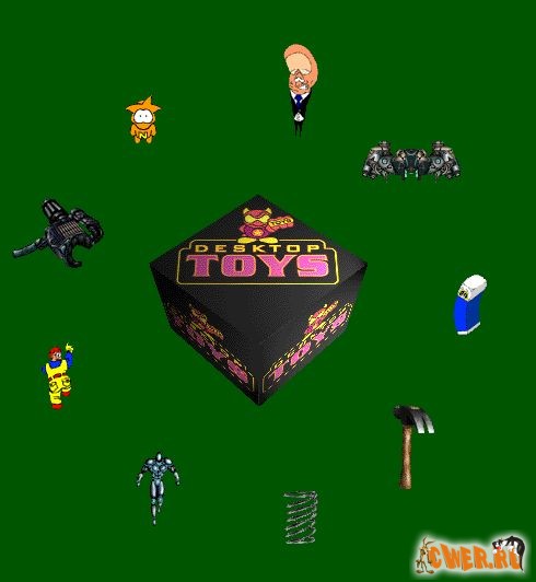 Несмотря на довольно почтенный возраст (программа была выпущена еще в 1995 году), Desktop Toys абсолютно не потеряли своей актуальности и входят в число лучших и самых популярных приколов. С помощью Desktop Toys можно разукрасить монитор в разные цвета, побить его молотком, попилить бензопилой, пострелять в него из автомата, огнемета и ракетомета, обработать его стиркой, поискривлять его, позабрасывать разной ерундой включая камни, гильзы, мониторы, жареную курицу, пауков и т.д., полетать по нему на космическом корабле и порасстреливать его оттуда… Можно даже побывать суперменом и "умертвить" несчастные пиксели лазером или просто разбить их кулаком. Думаете, все? Нет. Качайте и найдете еще кое-что интересное.