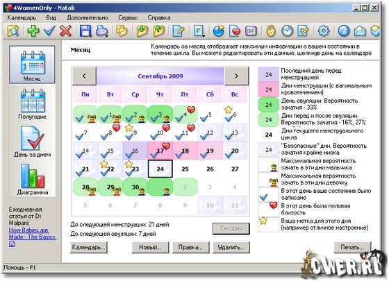 4WomenOnly - очень удобный и простой в использовании ежемесячный индивидуальный календарь менструальных циклов для женщин. Это одна из самых мощных систем для заботы о здоровье женщин. С помощью программы Вы сможете определить дни менструальных циклов, овуляций и дней, безопасных для занятий любовью, дабы избежать нежелательной беременности. Календарь поможет Вам использовать естественный метод контрацепции. Он обозначит дни с большей вероятностью беременности, а также поможет попытаться предсказать пол и дату рождения Вашего будущего ребенка. В календаре есть система напоминаний и ежедневного сбора информации о Вашем состоянии, календарь, статистика, возможность экспорта результатов и вывода их на печать, защита паролем и много других полезных функций.