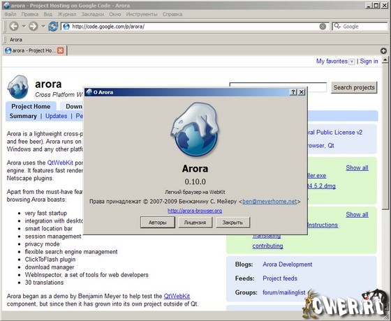 Скачать Arora 0.10.0 (10,2 МБ):