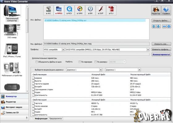 Axara Video Converter - комплексная программа специально созданная для работы с видеофайлами. Конвертирует в любой существующий формат. Кроме стандартных возможностей конвертации, работает с Sony PSP, iPod, Creative, Microsoft Zune и т.д. Имеется возможность закачки с YouTube, Google, YAHOO!, MySpace, AOL, CollegeHumor, metacafe и закачки непосредственно в iPod. И еще одна интересная возможность: благодаря новой технологии 2PassEncoding позволяет сконвертировать DVD-фильм в стандартный XviD MPEG4 без потери качества.