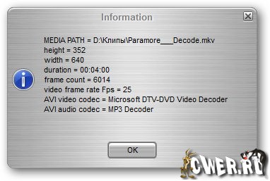 Плеер, позволяющий просматривать видеозаписи в формате FLV, AVI, DIVX, XVID, MP4, MPG, WMV, ASF, MPEG, M4V, MKV, DVR-MS, HDMOV, M2TS, M2T, MKA, 3GP, 3G2, 3GPP, 3GP2, MOV, QT, RM, RAM, RMVB. Можно сохранять отдельные кадры в картинки формата JPG, PNG, BMP.