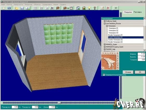 Простая навигация и отличный сервис этой программы, не вызывающий затруднений даже у новичка, поможет визуально оценить предварительный дизайн конкретного помещения, и, при необходимости, внести соответствующие изменения на стадии проекта. Кафель 4.0 создаст трехмерный макет, по реальным размерам, со всеми оконными, дверными и прочими объектами. Рассчитает практический расход материалов исходя из реальных размеров ремонтируемого помещения. Качественная 3D-визуализация программы наглядно покажет, как будет выглядеть та или иная коллекция кафельной плитки в вашем интерьере.