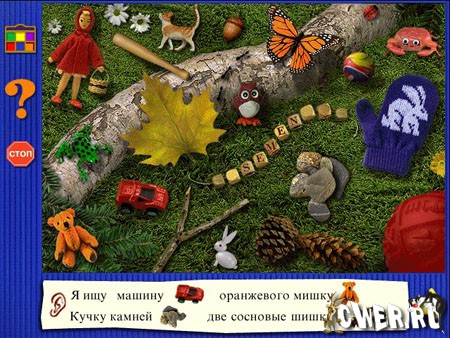 Основу игры составляют рифмованные картинки-загадки, для отгадывания которых необходимо найти на экране все перечисленные предметы. Не беда, если ребёнок ещё не умеет читать - все надписи в загадках снабжены маленькими изображениями вещей, которые надо найти, а чтобы услышать их название, достаточно щёлкнуть надпись. Темы игр близки и понятны малышу: "Городок из деревянных кубиков", "Ящик с игрушками" и "Природа". Иногда придётся хорошенько подумать, например, когда в загадке говорится: "Ищу трёх овечек рядком", - а на картинке рядом стоят только две овечки. Надо догадаться, что третью овечку можно перетащить к первым двум. Или в "Ящике с игрушками" столько разных игрушек, что для того, чтобы найти то, о чём спрашивается в загадке, хорошо бы сначала понять, в каком отделении ящика искать. Значит, малыш должен сообразить, по какому принципу рассортированы игрушки. Ну, а предметы в "Природе" можно разглядеть, только воспользовавшись специальной лупой.