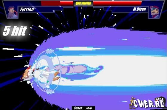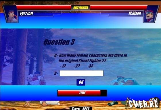Викторина в которой вам предстоит отвечать на вопросы на тему файтинга, если ответ верен - ваш персонаж произвёдёт атаку на противника, если нет - противник атакует вашего персонажа.
