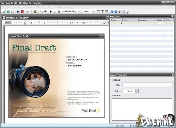 Final Draft - программа для написания сценариев для фильмов, телевизионных шоу и спектаклей. Программа представляет из себя многооконный текстовый процессор с массой специализированных под написание сценариев возможностей. Для использования программы вам совершенно не требуется знать правила оформления сценариев — Final Draft автоматически преобразует написанный вами сценарий под мировые стандарты. Эта программа широко используется Голливудскими сценаристами, в числе которых Том Хэнкс, Оливер Стоун и Джеймс Камерон. Среди основных возможностей программы: проверка орфографии, отметка сцен цветом и названиями для быстрого нахождения нужной сцены, легкая и быстрая подсветка выделенного текста различными цветами, автоматическое сохранение и многие другие возможности.