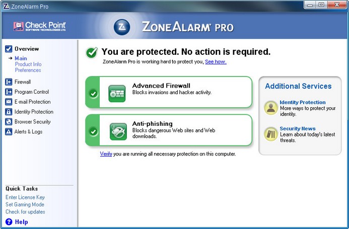ZoneAlarm Pro является персональным файрволом и предназначен для защиты компьютера от разного рода угроз при работе в интернете и локальных сетях. Ограничивает доступ к компьютеру из сети и позволяет контролировать доступ в сеть программного обеспечения, установленного на компьютере. Помимо этого, он может контролировать исходящие данные и пресекать отправку нежелательной информации по почте или через web-интерфейс. Программа контролирует входящую и исходящую почту. Во входящей почте он может переименовывать потенциально опасные вложения и помещать их на карантин. Количество исходящей почты может быть ограничено для предотвращения массовых рассылок при заражении компьютера почтовыми червями, что в сумме с контролем за приложениями препятствует работе червей. Файрвол может удалять с посещаемых страниц рекламу, экономя трафик и уменьшая время загрузки страниц. Блокировка скриптов и активного содержимого поможет предотвратить заражение компьютера при посещении определенных веб-сайтов.