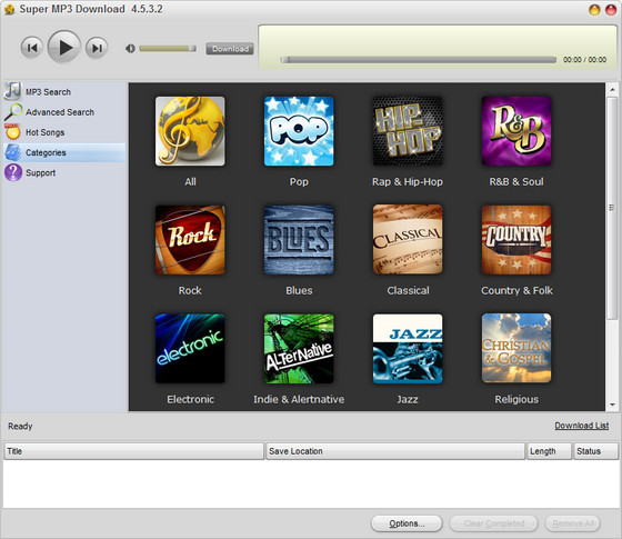 Super MP3 Download - прямой доступ к бесплатной музыке. Этот mp3 загрузчик надолго обеспечит Вас музыкальными композициями. В мире существуют тысячи групп и исполнителей, предлагающих свое творчество бесплатно. Шанс найти среди них что-нибудь по душе очень велик. Чтобы облегчить Ваш поиск, программа предложит топ сто недели и лучшее в четырнадцати жанрах. Вы сможете сначала прослушать мелодию и лишь потом сохранить её на жесткий диск.