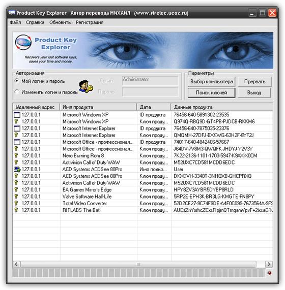 После запуска программы достаточно будет нажать Find Keys и она сама просканирует реестр, и выдаст список программ, установленных на компьютере и регистрационные данные к нем. В программе есть окно для авторизации Администратора, если установлены ограничения на уровне пользователей. Может работать по сети с другими компьютерами и по заданному диапазону IP адресов или по списку IP в текстовом документе.