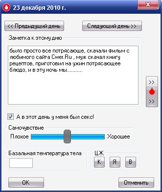Еще программа строит графики базальной температуры тела и самочувствия, определяет по ним дату овуляции, запароливает данные, показывает несколько календарей беременности, умеет экспортировать данные в таблицу Excel и многое другое.