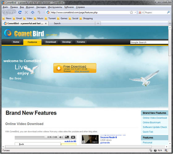 CometBird – шустрый браузер, построенный с использованием свободного портируемого движка Gecko, который также использовался при создании всемирно известного и популярного обозревателя Firefox. CometBird практически не отличим по интерфейсу от своего более раскрученного собрата, обладает возможностью расширения за счет плагинов и модулей, но в то же время имеет ряд характерных особенностей, как например возможность загрузки онлайнового аудио и видео, автосинхронизация закладок и наличие средств для проверки новых версий установленного на компьютере ПО и его быстрой загрузки.
