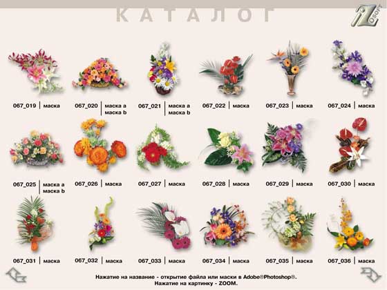 Незаменимый клипарт для профессионального дизайнера содержит высококачественные фотографии букетов цветов в формате JPG и альфа каналы к ним в файлах PSD. Также в архив включен PDF-файл с предпросмотрами и возможностью загружать непосредственно в Photoshop как фотографии букетов, так и маски к ним.