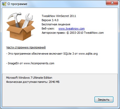 Скачать программу TweakNow WinSecret 2011 3.4.0 Rus (7,41 МБ):