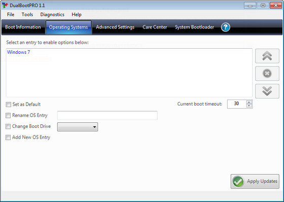 Программа DualBootPRO (VistaBootPRO) дает возможность поменять название ОС, изменять функциональные возможности и восстанавливать первоначальные конфигурационные данные. В расширенных настройках DualBootPRO можно сделать резервную копию загрузчика, экспортировать его конфигурацию и изменить детали загрузочного меню. С помощью программы DualBootPRO можно изменять порядок записей; редактировать, устанавливать дополнительные параметры в существующих загрузочных записях; создавать новые записи и удалять имеющиеся.