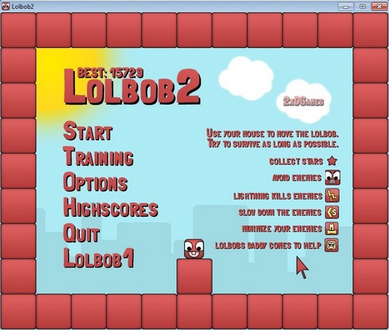 Lolbob - это весёлая аркадная игра. Вы управляете лолбобом, одним из самых смешных персонажей во всем интернете. Ваша задача выжить как можно дольше, избегая встречи с врагами, которые постоянно пересоздаются. В игре присутствуют 4 бонуса: бонус уменьшения врагов, бонус замедления врагов, отец лолбоба и молния, которая молниеносно убивает всех врагов. В игре присутствуют две звездочки, одна большая, другая маленькая. Обе звезды дают очки, маленькая от 1-1000, а большая всегда 3000 очков!