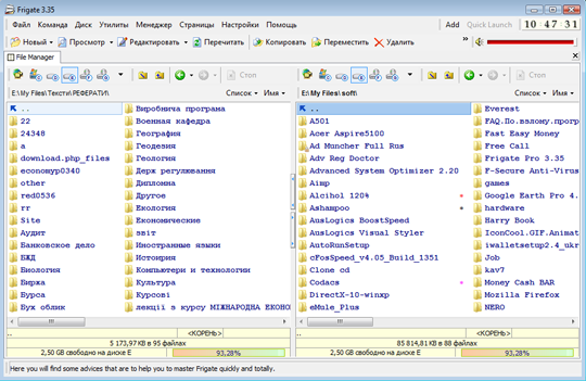 Фрегат - Это очень мощный файловый менеджер, позволяющий Вам быстро, интуитивно-понятно и, самое главное, с комфортом работать за своим компьютером. На сегодняшний день Фрегат является самым функциональным и самым мощным средством работы с файлами. Фрегат всегда находится впереди остальных менеджеров в плане применения новых технологий и концепций. Мы первыми сделали возможность выполнять все основные операции с файлами в фоновом режиме - теперь Вы можете копировать файлы и в тоже время ходить по директориям, мы разработали многостраничный интерфейс, который значительно упрощает работу и делает ее логически совершенной, мы сделали встроенный промотр многих форматов файлов, таких как doc, rtf, html, xls и многих других.