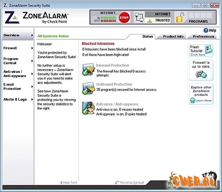 - Удобен в установке и использовании. ZoneAlarm Internet Security легко устанавливается и запускается, а интуитивно понятный интерфейс поможет настроить программу, исходя из Ваших потребностей.
