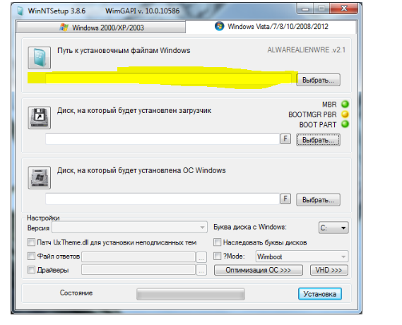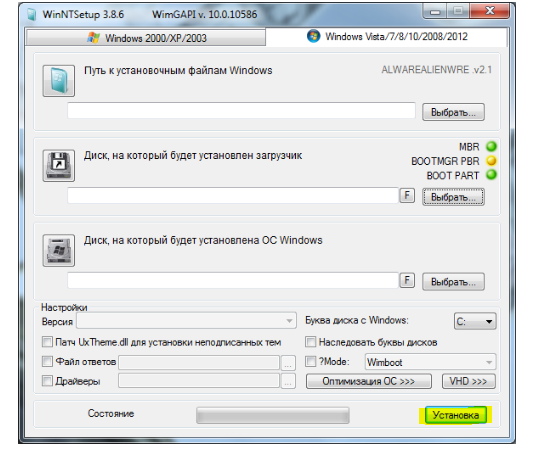 В поле "Путь к установочным файлам" Windows указываем файл Install.wim/Install.Esd