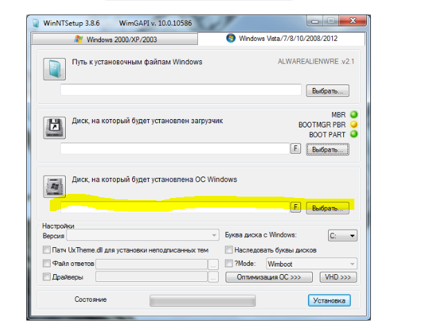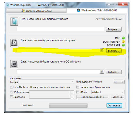 Далее в раздел "Диск, на который будет установлена Windows" вы указывайте соответствующий раздел на HDD.