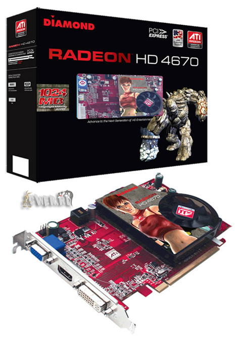 Модель Diamond Radeon HD 4670 1GB GDDR3 базируется на созданном по 55-нм технологии чипе RV730 XT (514 млн. транзисторов), укомплектована памятью GDDR3 объемом 1024 Мб и функционирует на частотах 750/900 Мгц.