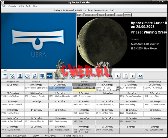 Эта программа является полнофункциональным календарем и вашим личным астрологом. Уникальная особенность программы - то, что в ней имеется два представления событий относительно календаря. Первое является стандартным, а второе основано на Зодиаке и делит календарь согласно знакам гороскопа.
