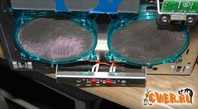 Для моддинга использовались два 80-мм вентилятора Cooler Master и 4 светодиодных пушки: две синих и две зеленых.
