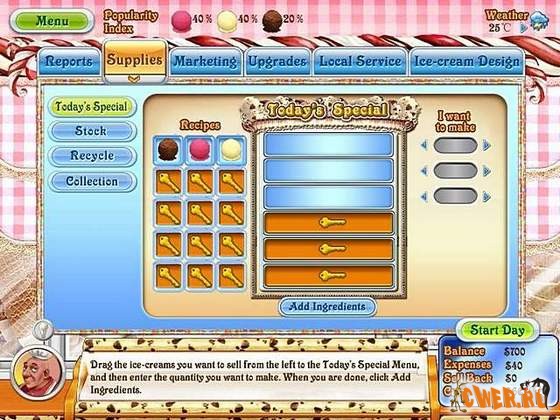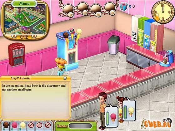 Способствуйте развитию вашего маленького лотка с мороженым до популярнейшего в стране брэнда, сравнимого с БаскинРоббинс. Испытайте свои способности управлять магазином, убедитесь что всего в достатке и обслуживайте посетителей.