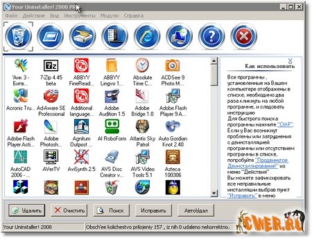 Включает в себя такую полезную функцию как удаление HotBar. Иногда, даже если приложение было деинсталлировано, панель инструментов всё-таки остается в Вашем Internet Explorer. Your Uninstaller! 2008 может избавиться от любой части HotBar оставшиеся в вашей системе.Программа так-же находит и деинсталлирует приложения не зарегистрированные в стандaртном приложении Windows "Установка и удаление программ".Работает с меню "ПУСК" и упорядочивает его, есть возможность редактировния "МЕНЮ АВТО-ЗАГРУЗКИ".Ищет некорректно установленные в системе приложения и с помощью функции "AutoFix" исправляет их.Производит очистку системы от всякого мусора скопившегося в ней.Восстанавливает кеш.Очищает и редактирует контекстные меню. Программа так же удаляет из реестра шпионов, известных как Ad-ware, экспортирует на печать список установленных программ и многое другое...