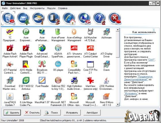 Программа имеет хорошо продуманный и организованный интерфейс. Есть полезная функция для пользователей, столкнувшимися с проблемой HotBar. Иногда, даже если приложение было деинсталлировано, панель инструментов остается в Вашем Internet Explorer, Your Uninstaller! может избавиться от любой части HotBar. Программа так же удаляет из реестра шпионов, известных как Ad-ware, экспортирует на печать список установленных программ и многое другое...