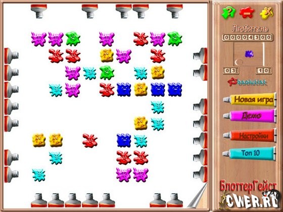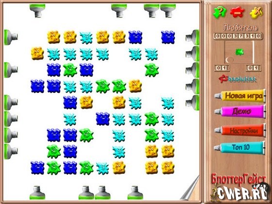 Выдавливая из тюбиков краску, вы будете создавать разноцветные пятна на холсте. Если пятно будет достаточно большим, оно тут же исчезнет. Кляксы, выдавленные из тюбиков, будут двигаться по игровому полю, подчиняясь своим странным правилам. Найдите закономерность в их движении! Стоит вам полностью освободить полотно от краски, как уровень будет пройден, и вы займете свое заслуженное место в таблице рекордов.