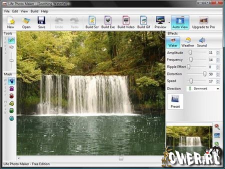 Life Photo Maker позволяет добавлять визуальные и звуковые эффекты к вашим фотографиям. Вы можете легко добавить водяные эффекты, такие как водопад, берег или озеро наложив водяную маску на ваши фото. Вы также можете добавить эффекты снега и дождя, а также до 8 каналов звуковых эффектов. Полученный результат можно сохранить в виде скринсейвера, видео (.avi), или анимированного изображения (.gif).